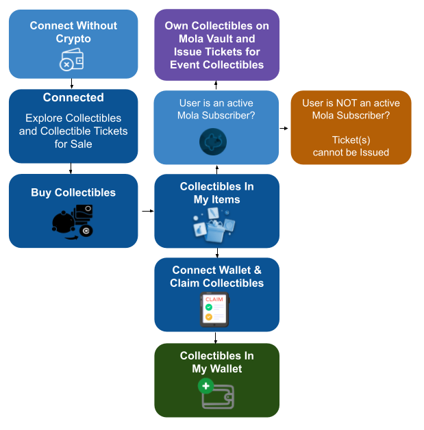 Mola Digital now has a Connect without Crypto for its audience that is not crypto-ready just yet. This feature allows users to purchase Collectibles and Collectibles Tickets without connecting a crypto wallet.